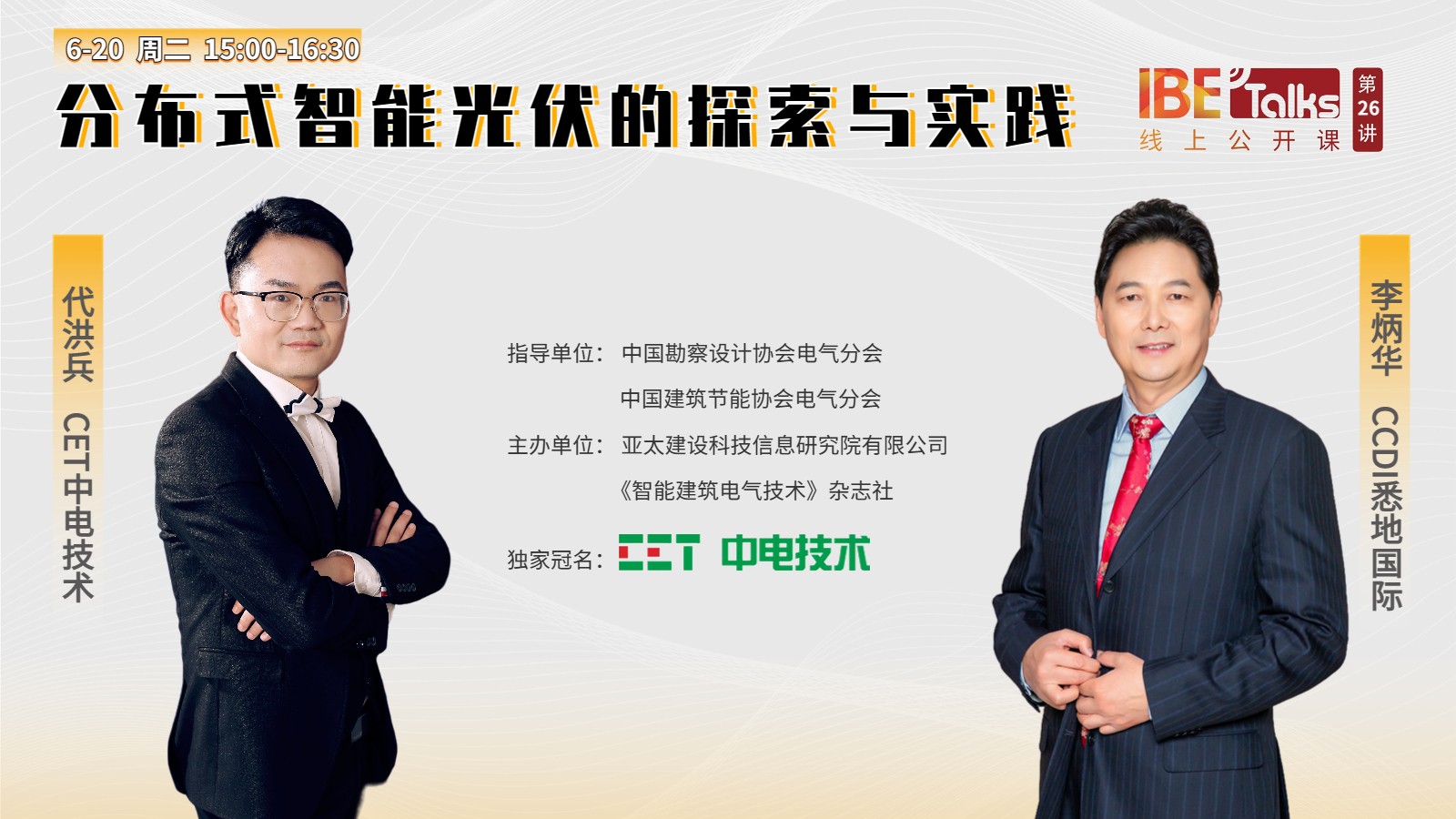 本期 IBE Talks 以“分布式智能光伏的探索与实践”为主题,联合深圳市中电电力技术股份有限公司,特别邀请CCDI悉地国际集团电气总工程师李炳华先生、CET中电技术分布式智能光伏事业部战略总监代洪兵先生,从分布式光伏的基础理论入手,深入探讨如何提高分布式光伏的能源利用效率,降低电力用能成本,提高用电可靠性,实现绿色低碳的生产运行,助力国家双碳战略的发展落地。